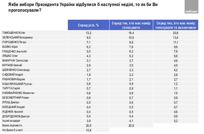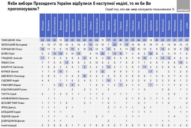 • Лидером президентского рейтинга является Ю.Тимошенко, которую готовы поддержать 20,8% тех, кто определился с выбором и намерен участвовать в выборах. За В.Зеленского готовы проголосовать 13,4%, П.Порошенко - 11,1%, Ю.Бойко - 9,6%, А.Гриценко - 7,8%, О.Ляшко - 6,6%, С.Вакарчука - 4,6%, Е. Мураева - 4,5%, А.Шевченко - 4,2%. Рейтинг других кандидатов - менее 3%. В то же время, почти треть опрошенных или еще не определились с выбором кандидата, или не намерены голосовать на выборах. • Ю.Тимошенко лидирует практически во всех областях Украины за исключением Донецкой, Луганской и Харьковской, где первую позицию занимает Ю.Бойко. На Львовщине она разделяет лидерские позиции с П.Порошенко и А. Гриценко, в Ивано-Франковской - с А.Шевченко, на Николаевщине - с В.Зеленским. • В годовой динамике заметен постепенный, начиная с февраля с.г., рост рейтинга Ю.Тимошенко. С появлением в электоральных рейтингах также вырос показатель В.Зеленского. Практически неизменным остался рейтинг П.Порошенко, Ю.Бойко и О.Ляшко. Определенные потери понесла поддержка А.Гриценко и С.Вакарчука, значительные - В.Рабиновича. При этом уровень поддержки А.Садового и Е. Мураева не изменился. • 21% верят, что на президентских выборах победит Ю.Тимошенко. За последний год количество тех, кто убежден в ее победе, выросло вдвое. В победе П.Порошенко уверены 12,8%, что несколько меньше чем в предыдущем году (15%). Победу В.Зеленского видят около 5%, Ю.Бойко - 3,5%, О.Ляшко - 2,2%, А.Гриценко - 2,1%. В положительный результат других верят менее 2% опрошенных. Ю.Тимошенко по этому показателю лидирует во всех областях, за исключением Львовщины, где больше верят в победу на выборах П.Порошенко. В своих фаворитах уверены в основном сторонники Ю.Тимошенко (81%) и П.Порошенко (77%). • Антирейтинг возглавляет П.Порошенко. За него не проголосовали бы ни в коем случае 50,3% респондентов, которые намерены голосовать на выборах. В этом показателе действующий глава государства занимает первую строчку во всех регионах, кроме Львовщины, где лидером антирейтинга является Ю.Бойко. • Моделирование второго тура президентских выборов среди всех опрошенных дало следующие результаты: Ю.Тимошенко уверенно побеждает в парах с П.Порошенко (29% против 15%) и Ю.Бойко (29% против 16%). Также у нее высокий результат в паре с А. Гриценко (26% против 21%) и почти равные позиции в паре с В.Зеленским (25% против 26%). Среди тех, кто намерен участвовать в голосовании в первом туре, результаты следующие: Ю.Тимошенко также уверенно лидирует в парах с П.Порошенко и Ю.Бойко (34% против 18%), имеет преимущество в паре с А. Гриценко (30% против 25%) и незначительное с В.Зеленским (30% против 29%). • В региональном разрезе Ю.Тимошенко во втором туре при условии выхода в него П.Порошенко лидирует во всех без исключения регионах. При попадании в него Ю.Бойко лидер Батькивщины уступает последнему на Донбассе и Харьковщине. При условии попадания во второй тур А.Гриценко, Ю.Тимошенко уступает ему на Львовщине, Тернопольщине, Хмельниччине и Черкащине. В.Зеленский опережает Ю.Тимошенко во втором туре в большинстве регионов Востока и Юга, одновременно уступает в большинстве областей Западной и Центральной Украины. • В рейтинге партий лидирует Батькивщина, которую поддерживают 21,7% тех, кто определился с выбором партии и намерен голосовать на выборах. За партию «Слуга народа» готовы отдать свои голоса 12,4%, БП
