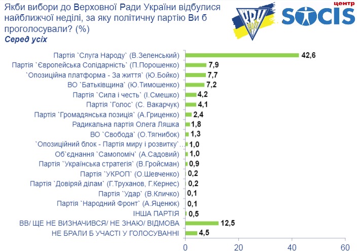 Терміни проведення дослідження: 29 травня – 6 червня 2019 року; Метод збору первинної соціологічної інформації — стандартизоване інтерв’ю „face-toface” за місцем постійного проживання респондентів; Опитування проводилося за вибіркою, яка репрезентує доросле населення України в цілому, за такими ознаками як: стать, вік (від 18 років) та тип поселення (місто/село); Загалом було опитано 4000 респондентів; Статистична похибка дослідження (довірчий інтервал) не перевищує +/-1,6%; Середня тривалість одного інтерв’ю склала 17 хвилин. ![]() ![]()